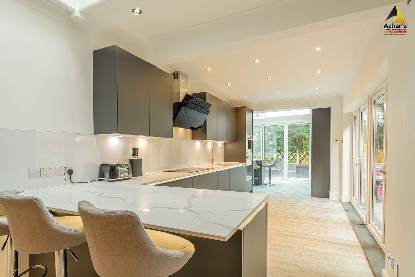This one is finished with Wickes Calcutta Gold quartz worktop and equipped with Multiple Neff ovens, Coffee machine that connect to your phone, warming draw, instant 4-1 boiling water tap, integrated tall fridge and freezer and pull-out larders and pull-out corners.