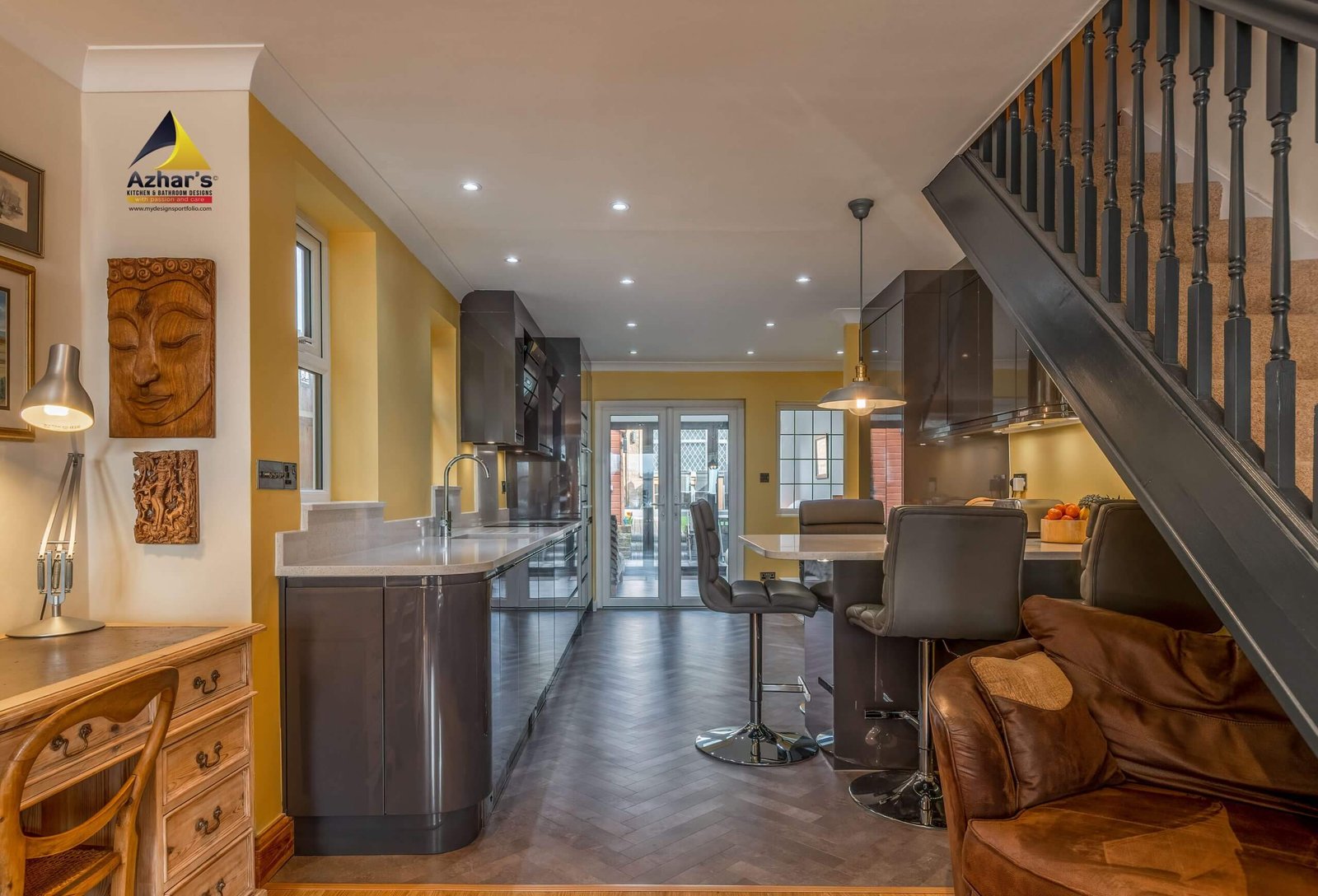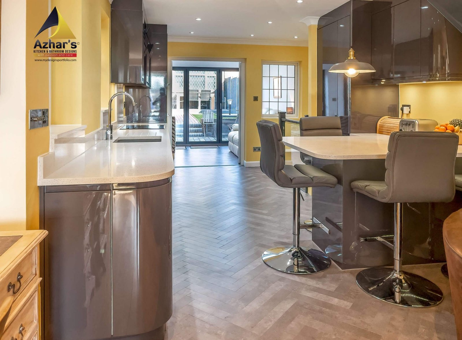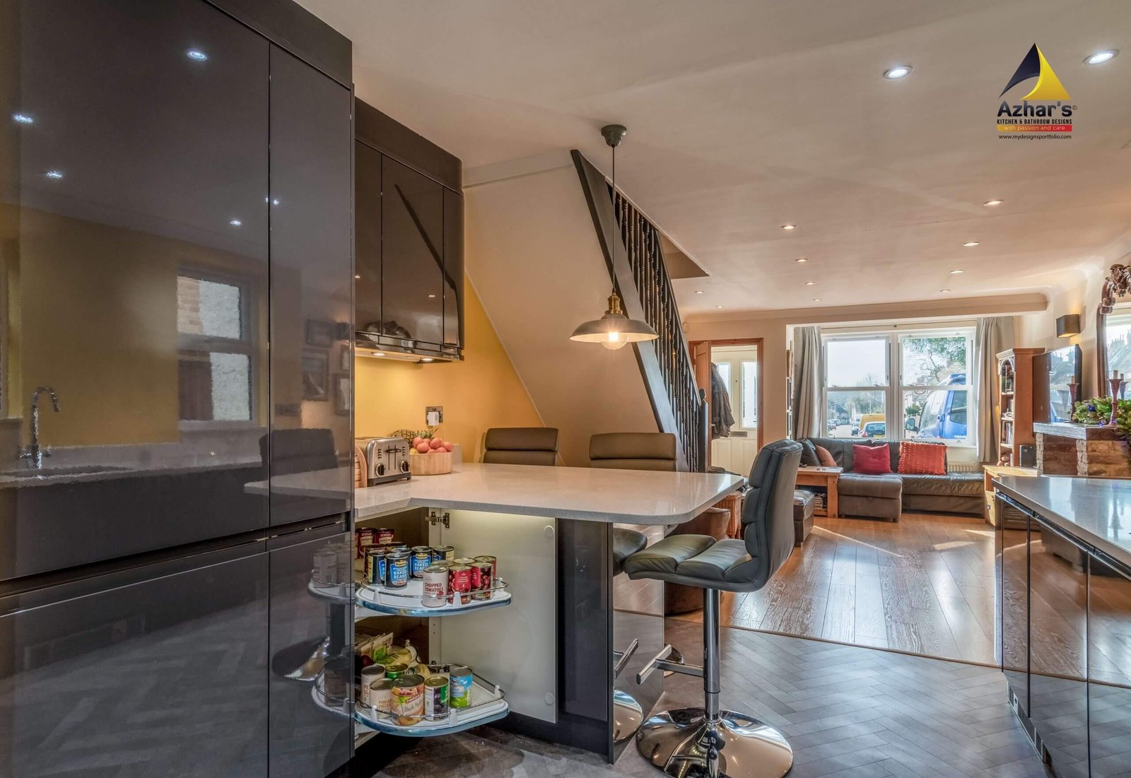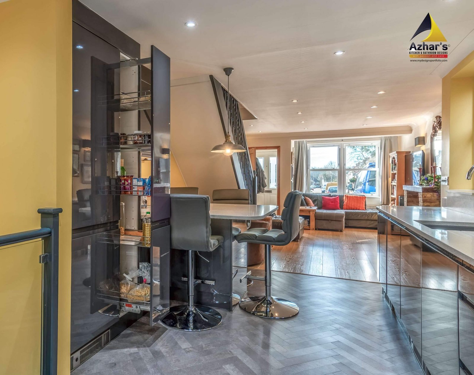 This beautiful Kitchen is installed at a house on New Road in Rickmansworth. The features include Quartz Worktop with an upstand and windows cill, curved ends, pull-out larder, pull-out corner, quartz splashback, under mounted sink with drainer groves and a great breakfast bar. Also, a separate utility room is located in the cellar.