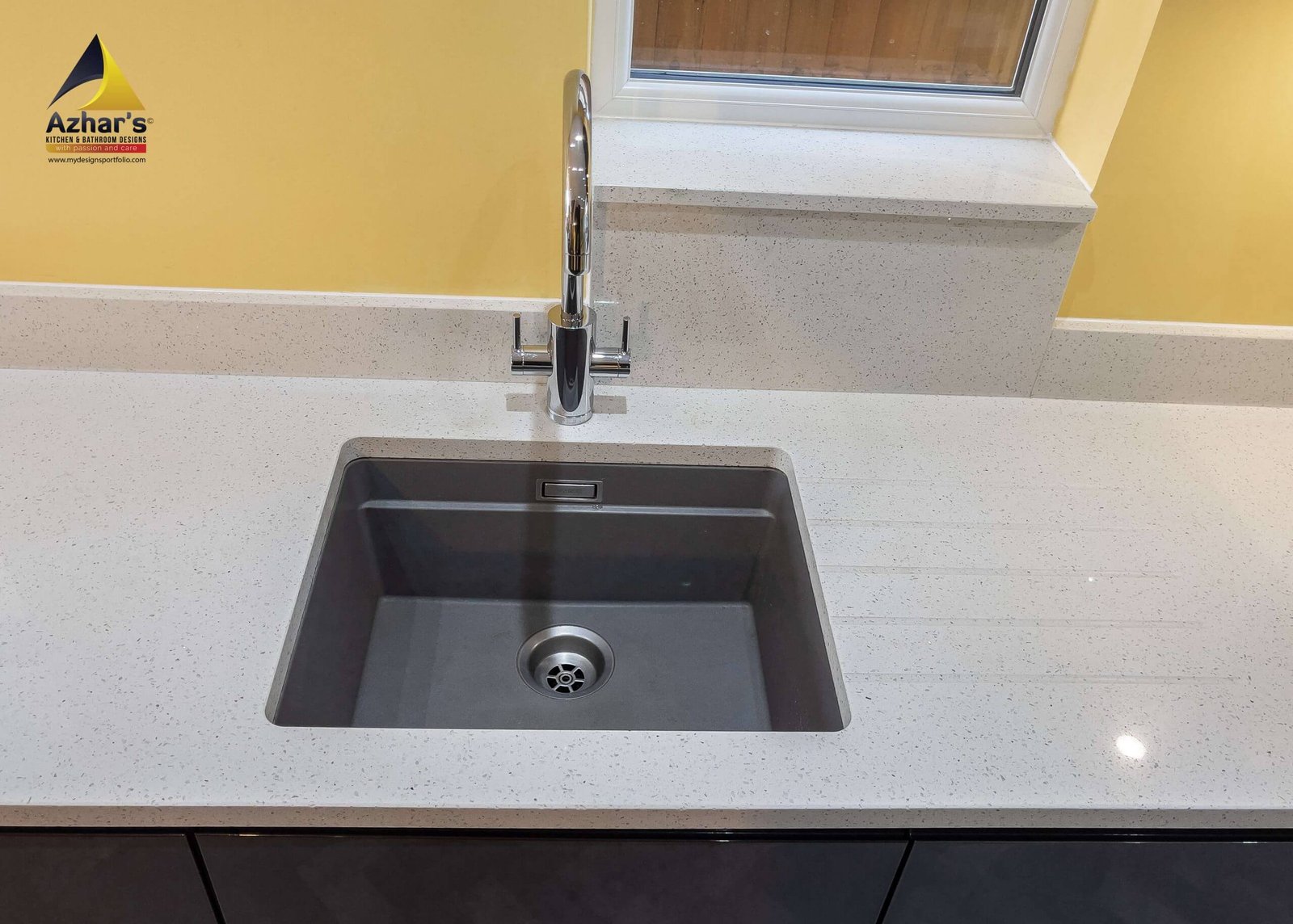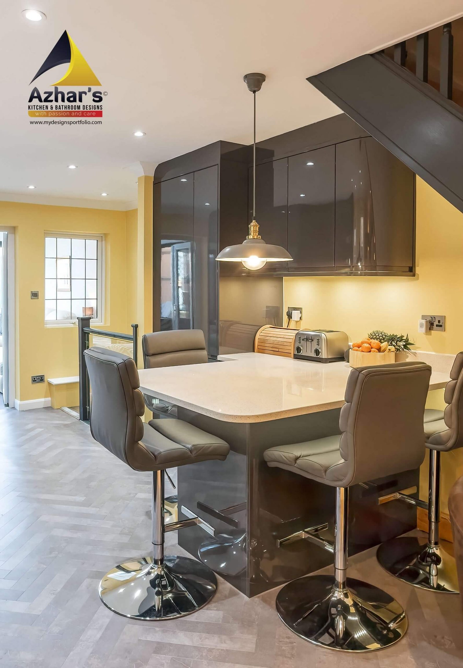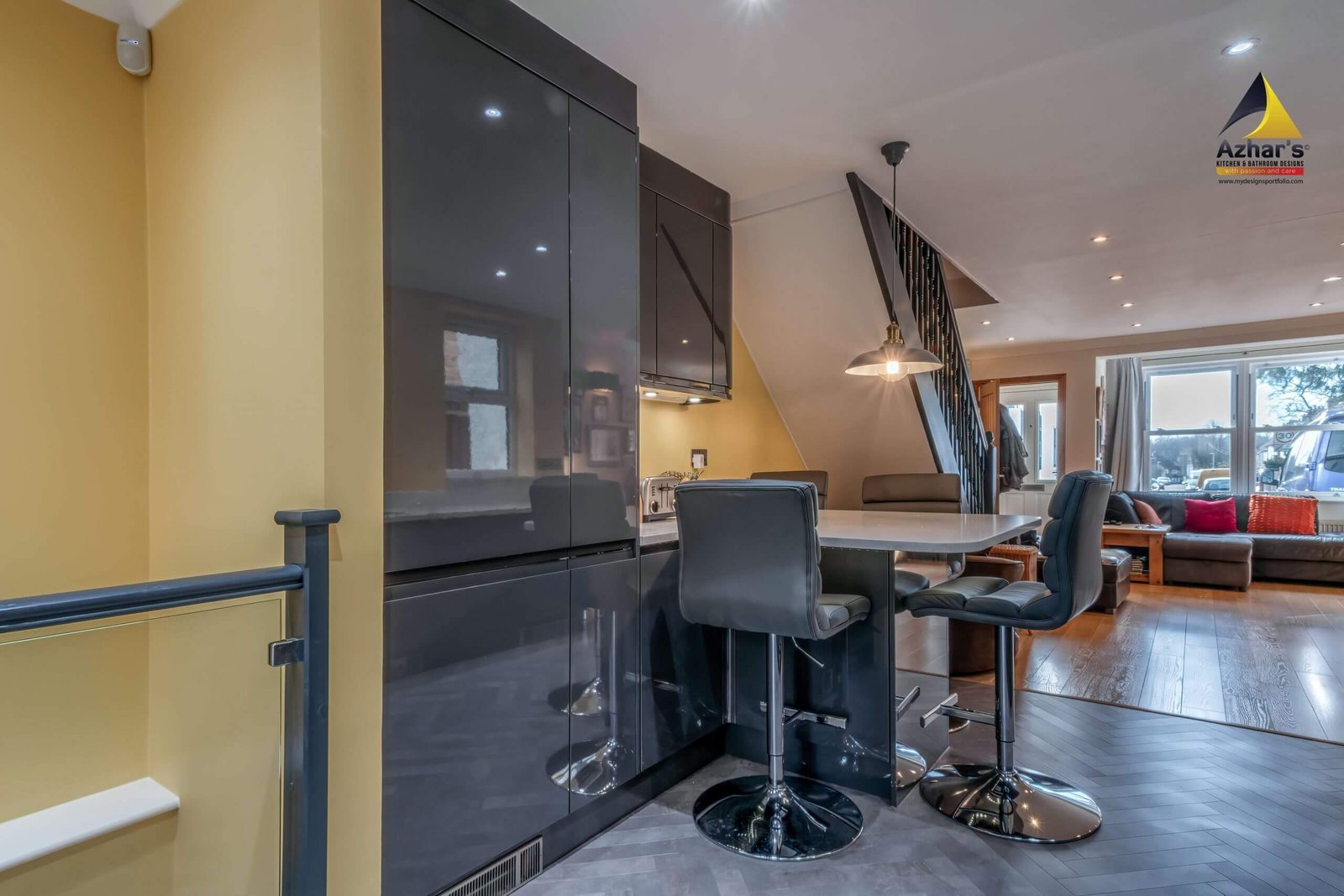This beautiful Kitchen is installed at a house on New Road in Rickmansworth. The features include Quartz Worktop with an upstand and windows cill, curved ends, pull-out larder, pull-out corner, quartz splashback, under mounted sink with drainer groves and a great breakfast bar. Also, a separate utility room is located in the cellar.