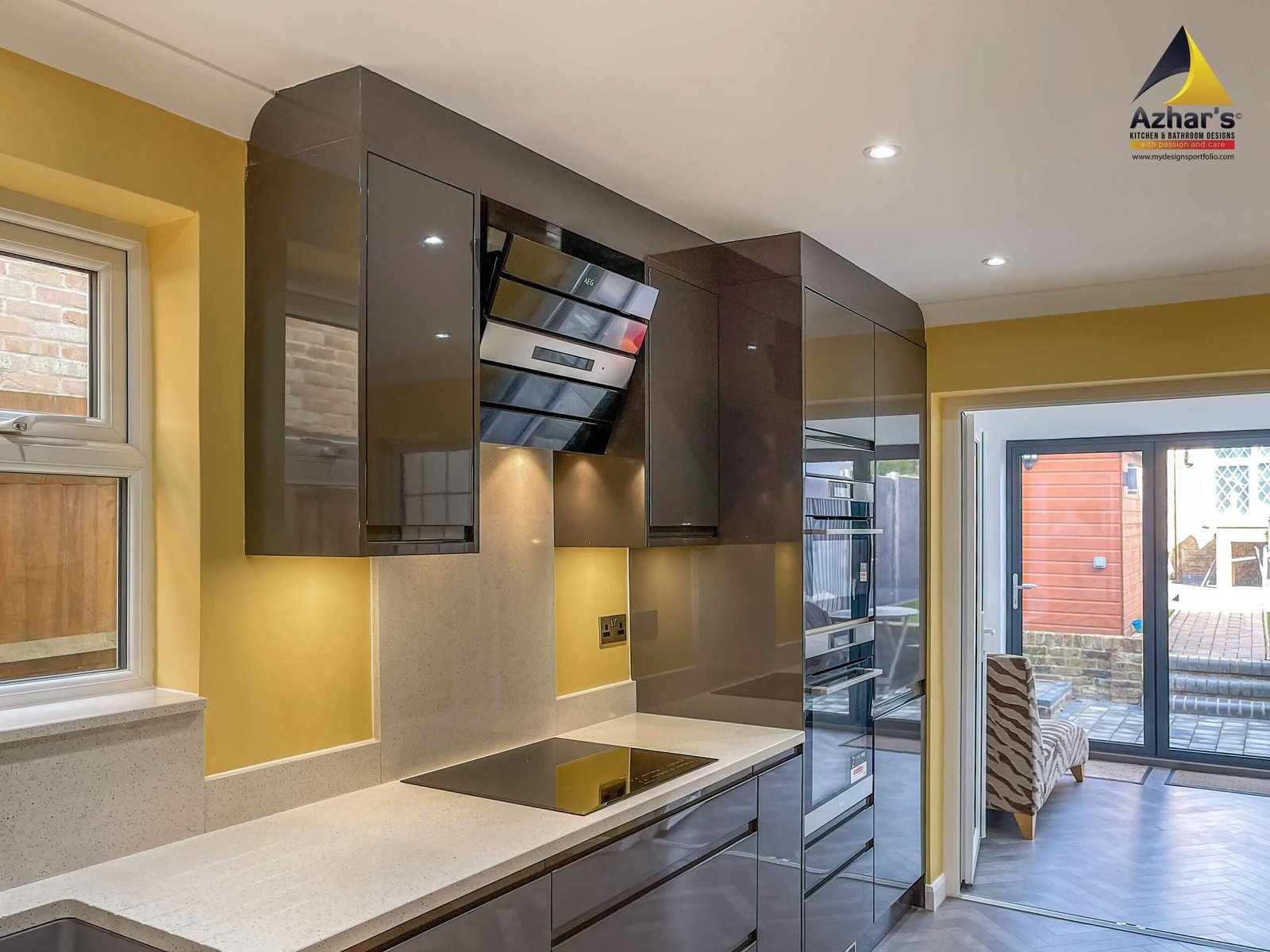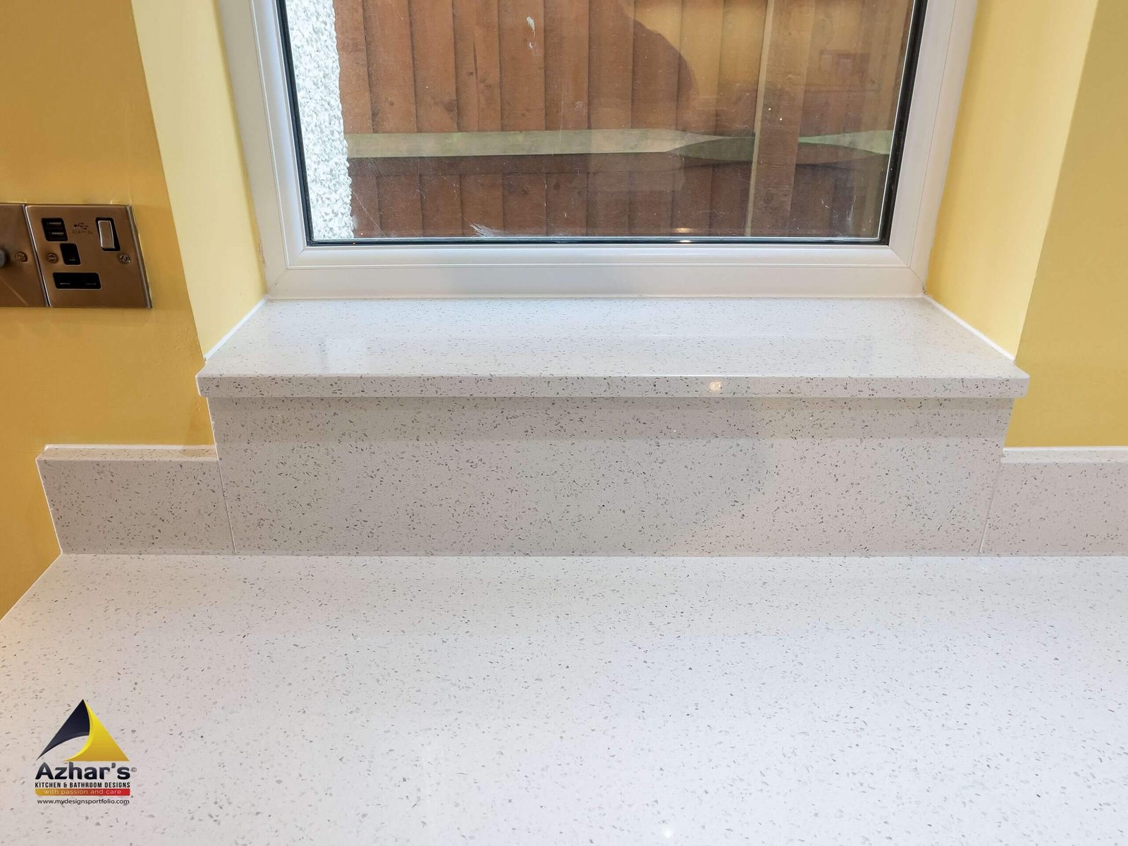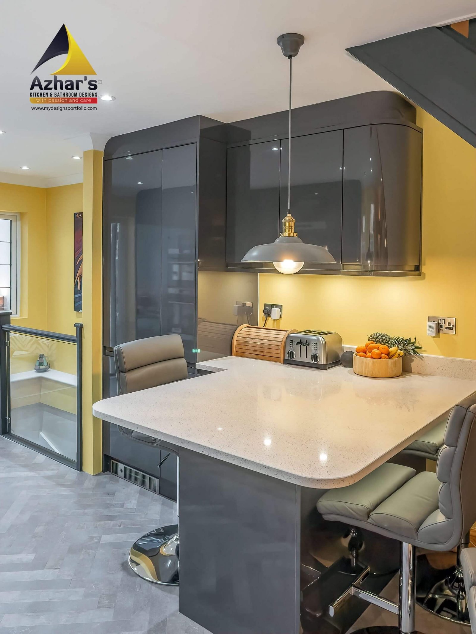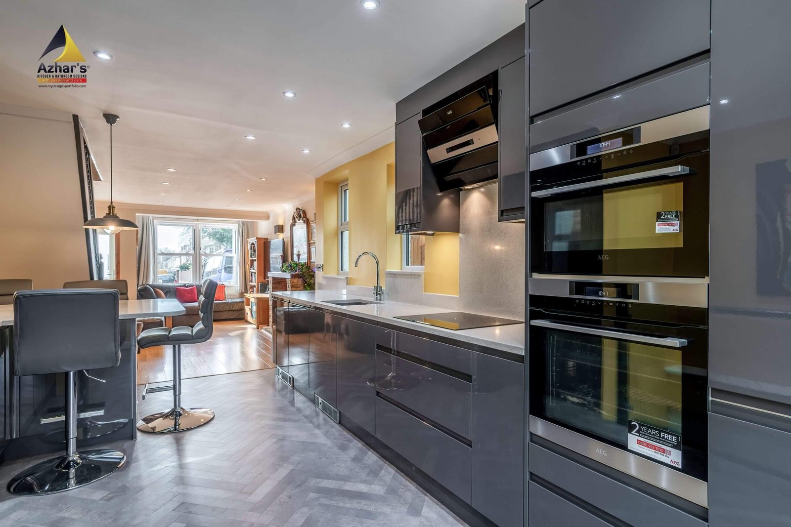 This beautiful Kitchen is installed at a house on New Road in Rickmansworth. The features include Quartz Worktop with an upstand and windows cill, curved ends, pull-out larder, pull-out corner, quartz splashback, under mounted sink with drainer groves and a great breakfast bar. Also, a separate utility room is located in the cellar.