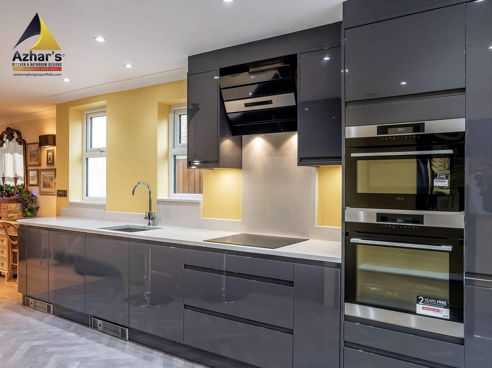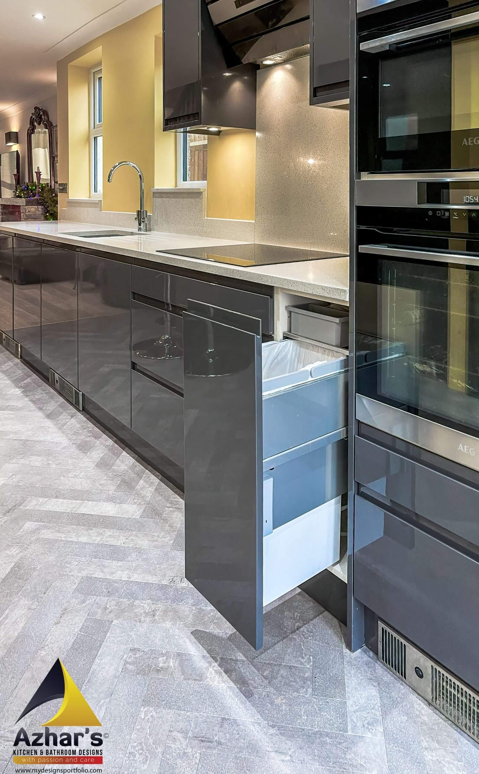 Sofia Graphite’s minimalist design creates maximum impact. This high gloss, lacquered deep grey kitchen has a striking linear design for a clutter-free contemporary feel. It works beautifully against natural woods and stone, complementing any colour palette.